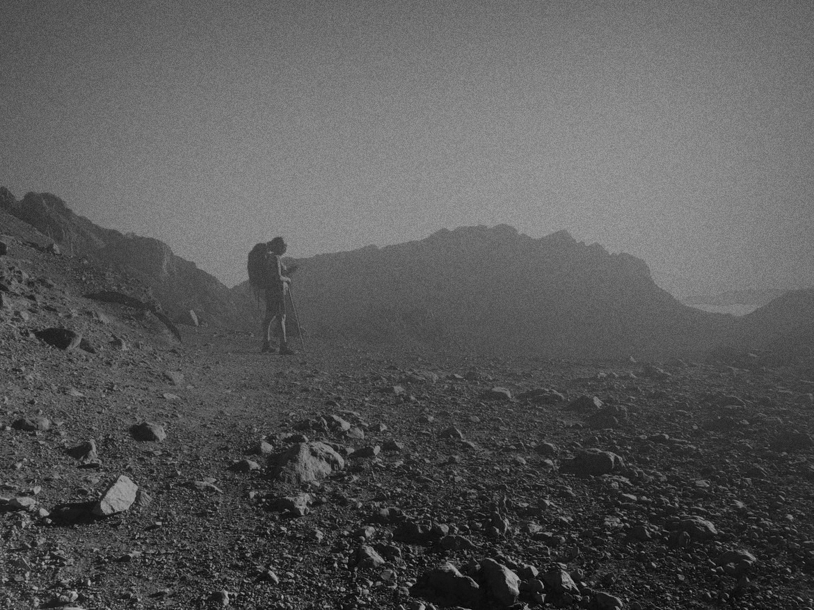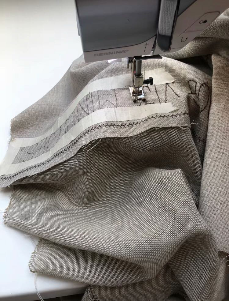 Two curtains carry heavy stitched fabric, inscribed with words and deeper tones that reflect the weight of control and resistance. The other three remain unburdened, floating freely through the space. On them, charcoal drawings trace a journey through mountainous landscapes — a place where, for me, surrender becomes possible and freedom begins.